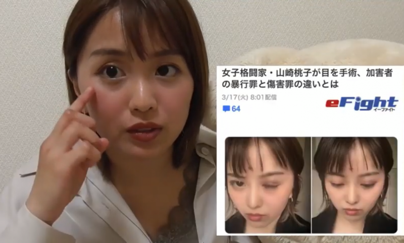 指を指しながら目の状況を説明する山崎(山崎桃子YouTubeチャンネルより)
