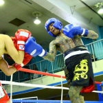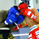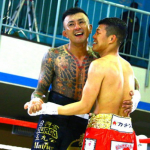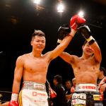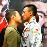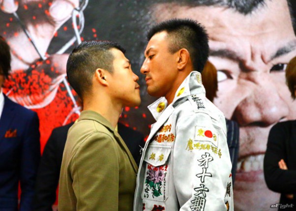 にらみつけるユウタ(右)に亀田もスイッチが入ったのか顔を近づけてにらみ返した