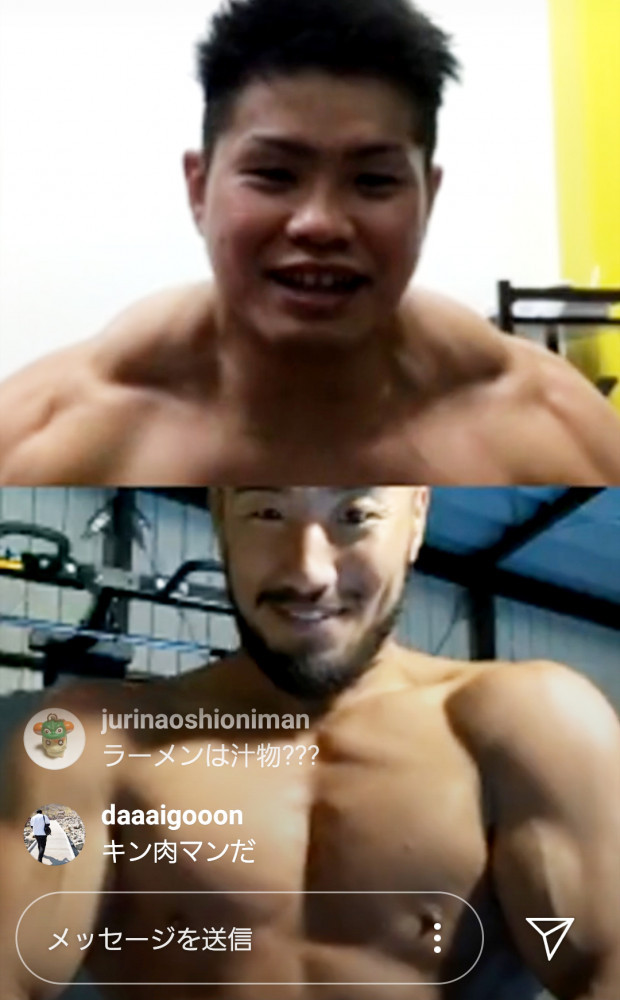 5月2日のインスタライブでお互いに筋肉アピールする鈴木(上)と手塚(鈴木のインスタライブより)