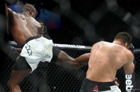 極真空手ゆずりの飛び後ろ蹴りを相手の顔面にヒットさせるユライア・ホール