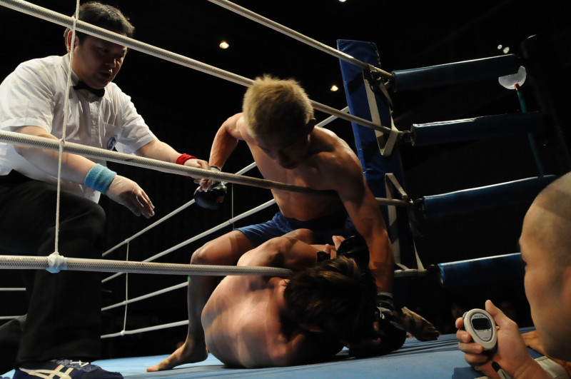 ラウンド終盤にパウンドを連打する堀口=10年5月9日