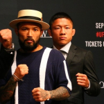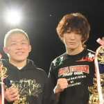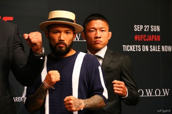 2015年、UFC JAPANに参戦が来まった山本KIDと堀口恭司の両者がファイティングポーズを決める