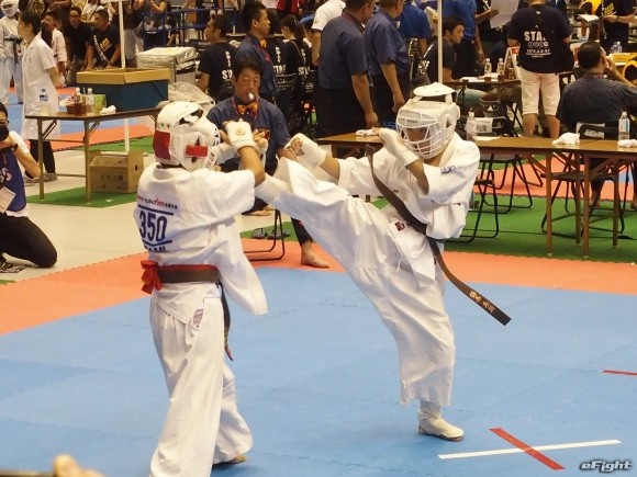 ヘッドギアをつけて戦う少年拳士たち=新極真会ドリームカップにて