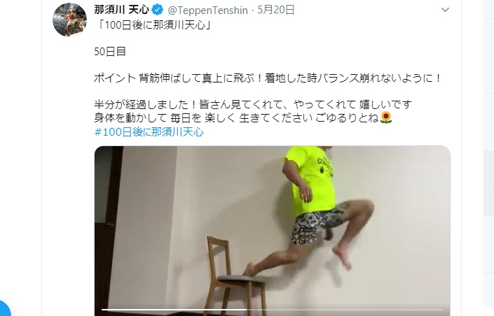 50回目は飛び膝蹴りに似た「イス」を使っての片足ジャンピングスクワット(@TeppenTenshinより)