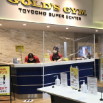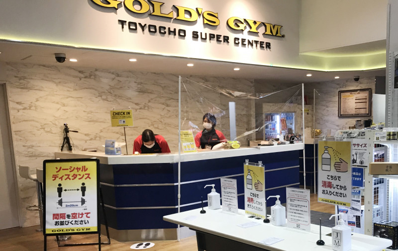 都内のスポーツジム が6月1日より再開。ゴールドジムの受付はビニールシートでのガードや消毒液などが置かれる