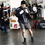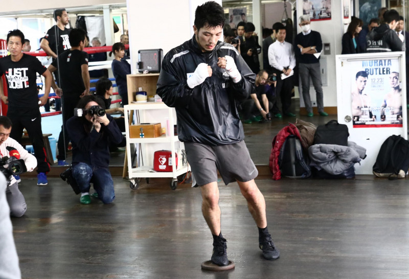 ジムでダンベルプレートを床に置きステップと軸のトレーニングをする村田諒太(19年12月)