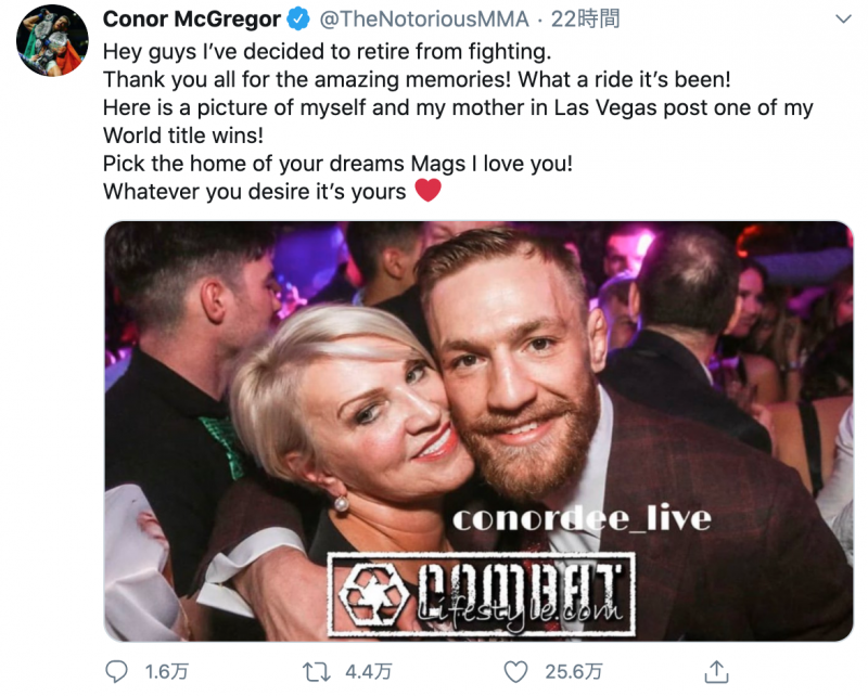引退宣言したSNSでマクレガーは母親との2ショット写真をアップした(@TheNotoriousMMAより)