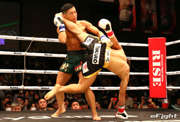 右手をマットに着いて放つ左ハイキックを得意とする田丸(右)