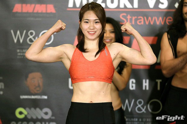 まぶしい笑顔でマッスルポーズの魅津希=計量