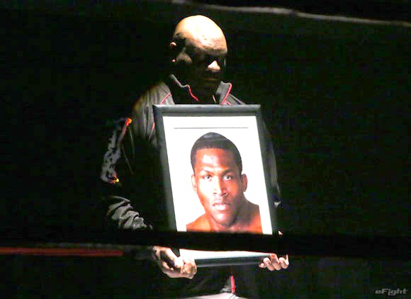 ランデルマンの遺影を持つボブ・サップ(16年2月=IGFにて追悼の10カウントゴング)