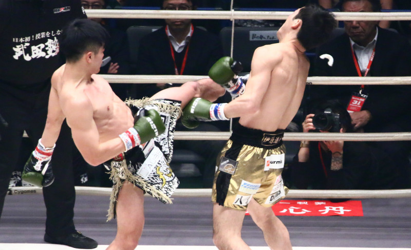 マウスピースが吹き飛ぶほどの前蹴りを食らわせる那須川=昨年大晦日
