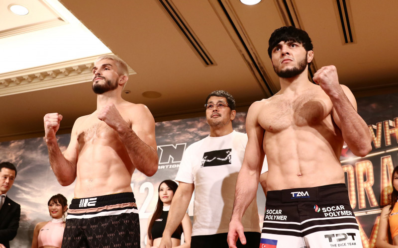 ムサエフ(右)と高田延彦(中央)=19年12月30日のRIZIN前日計量