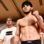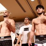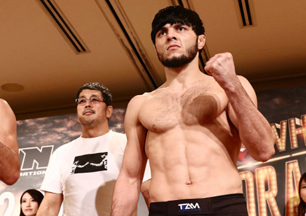 ムサエフ(右)と高田延彦(左)=19年12月30日のRIZIN前日計量にて