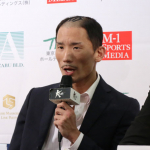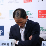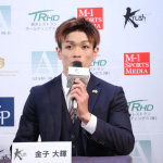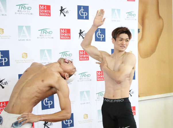 フラッシュバックと名付けたメンチ切りを披露する堀井(左)と、ラウェイのポーズをとる金子