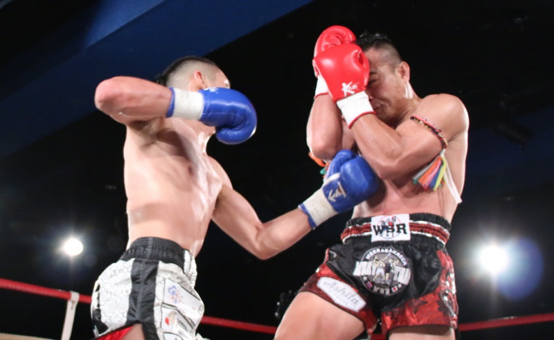 篠原の強烈なパンチはしっかりガードするゴンナパー(右)