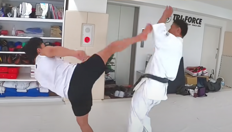 朝倉未来が極真時代に得意だったという、後ろ回し蹴りを見せる(KARATE家チャンネル内藤道場より)
