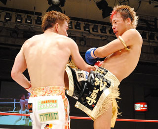 強烈なヒザ蹴りを繰り出す武尊(右)