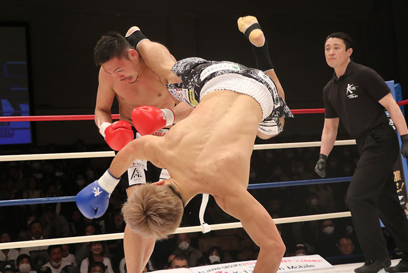 アクロバティックな大技、センチャイキックを繰り出す佐々木