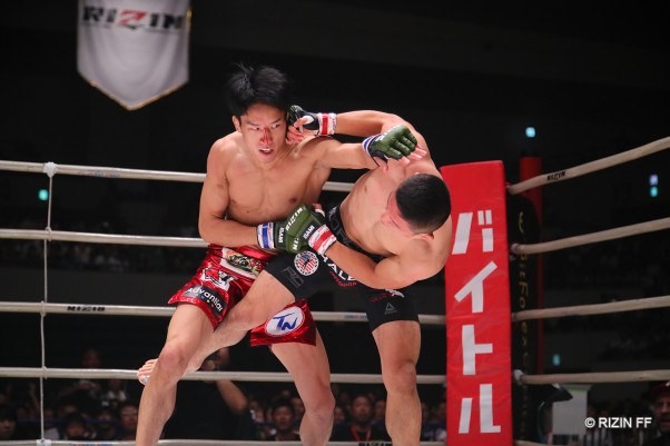 昨年8月、当時RIZINとベラトールのバンタム級王者だった堀口を1RKOする大金星をあげた朝倉海(左)