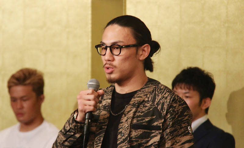 会見で意気込みを語る矢地