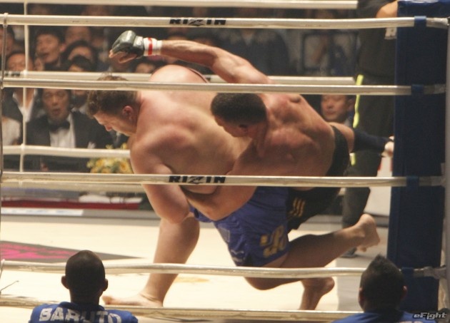 元力士のバルトが柔道技でピーター・アーツを投げる。バルトが判定勝利