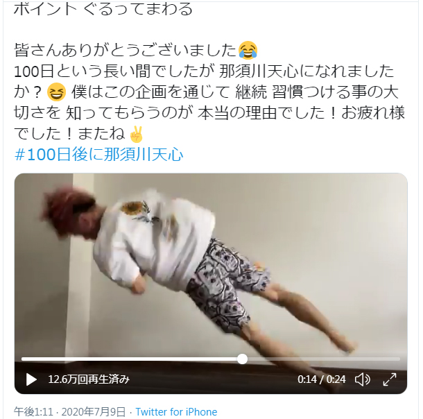 “スーパーマン腕立て”のワンシーン。腕立ての途中で回転してみせる那須川(@TeppenTenshinより)