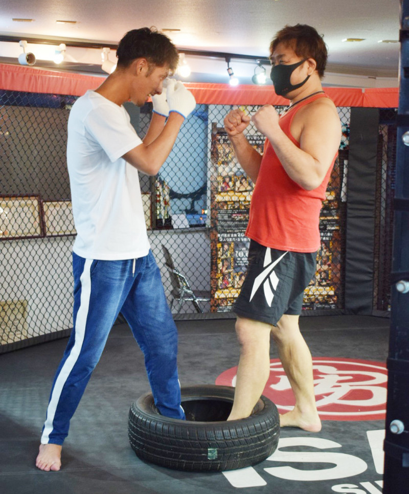 タイヤに片足を入れて戦うタイヤファイトを体験する和田犬