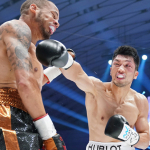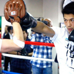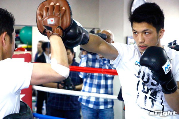 練習でミットに右ストレートを正確に打ち込む村田諒太=18年4月