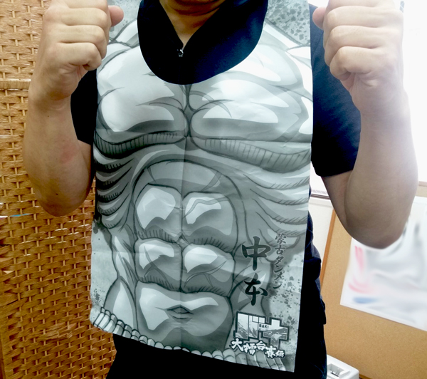 紙エプロンをつけるとスタッフもたちまちバキボディに