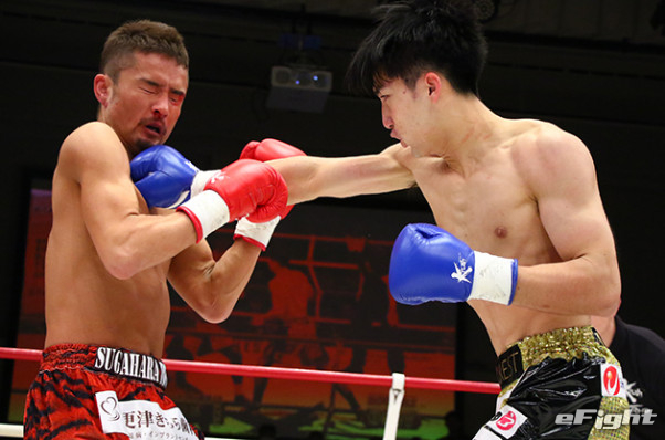 西京(右)が右ストレートで島野からダウンを奪い高校生でKrush王者に=19年3月