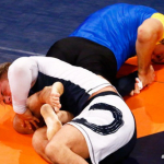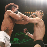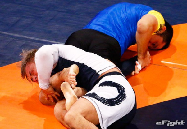 得意の腕十字固めを実力者・金原(左)に極めた中村(右)=18年