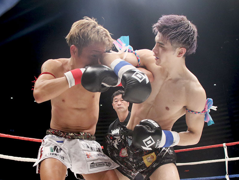 強烈なヒジ打ちをヒットさせる栗秋(右)