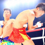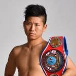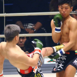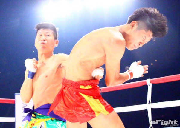 素手での強烈な左ボディで、相手をくの字にさせる浜本