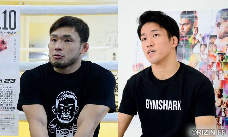 明日バンタム級タイトル戦で対決する朝倉海(右)と扇久保(左)