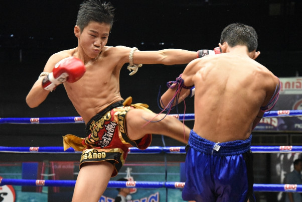 ラジャダムナンで鋭いミドルキックを蹴り込む押川