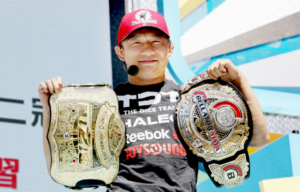 堀口の持っていたベラトールのベルト(右)を奪い合う