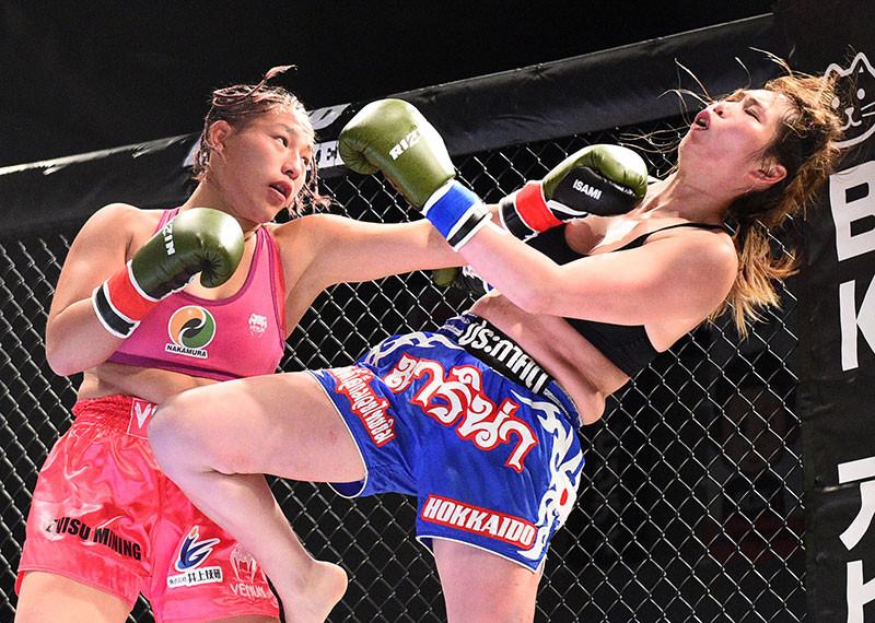 重いパンチを打ち込んでいくレイナ(左)