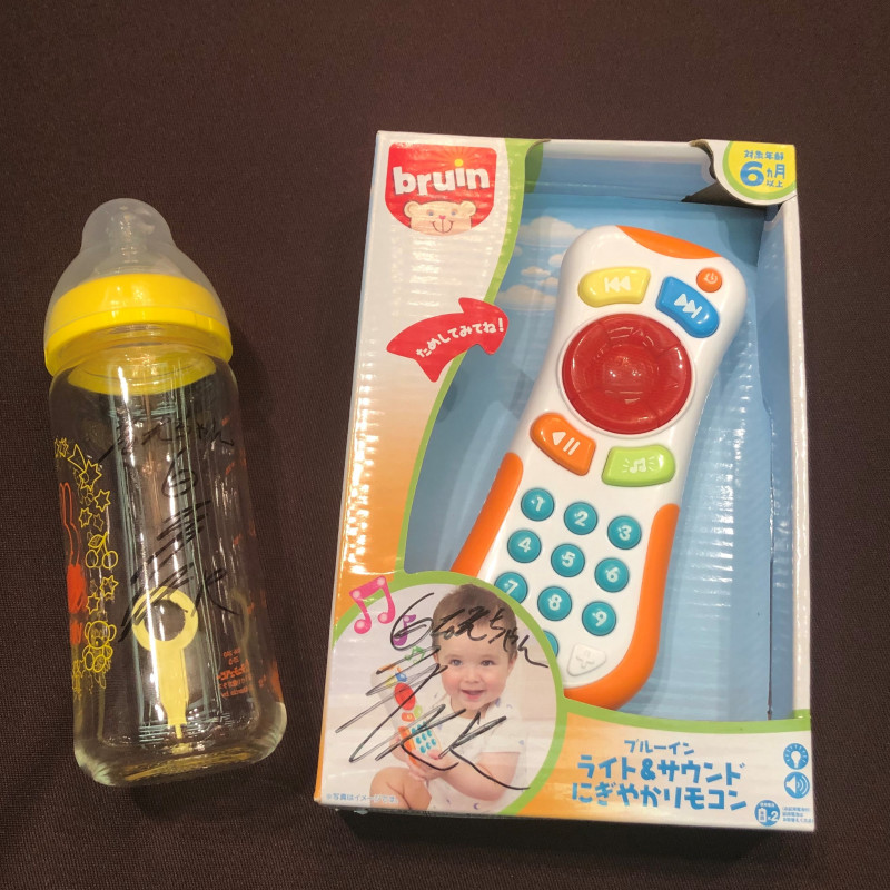皇治から那須川に贈られたおもちゃの携帯電話と哺乳瓶、しっかりと皇治のサインが入っている