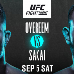 17年3月、マーク・ハント(右)にキックを蹴り込むアリスター。3RでKO勝利を決めた(PHOTOS By courtesy of Zuffa LLC / Getty Images)