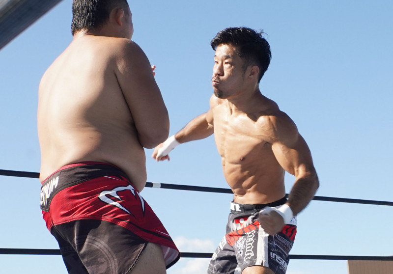 プロレスデビュー戦でも容赦ないローキックを叩き込み、約2分でKO勝利したT-98(c)ハードヒット実行委員会