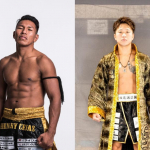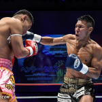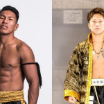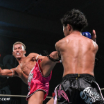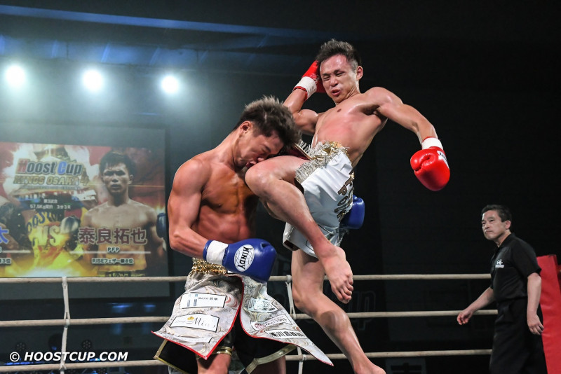 一刀の顔面にヒザ蹴りを見舞う泰良