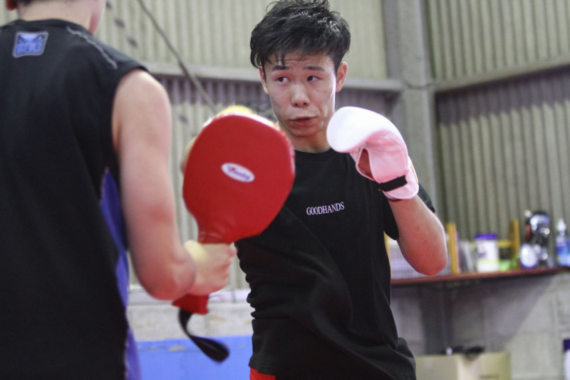 9月22日のK-1大阪大会で江川戦に挑む椿原。軽快なジャブとストレートをミットに叩き込む©️K-1