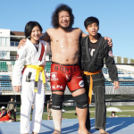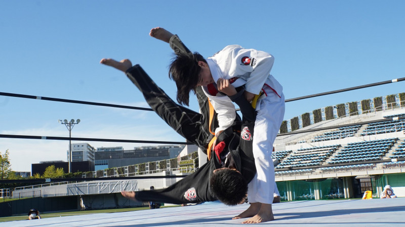 小学6年の秋田美咲さんが青空の下、柔術のデモンストレーションで中2の男子に投げを決める