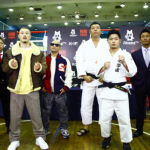 格闘代理戦争の参戦会見でのスソン(前列左から2番目)。サングラス姿のKIDが見守る