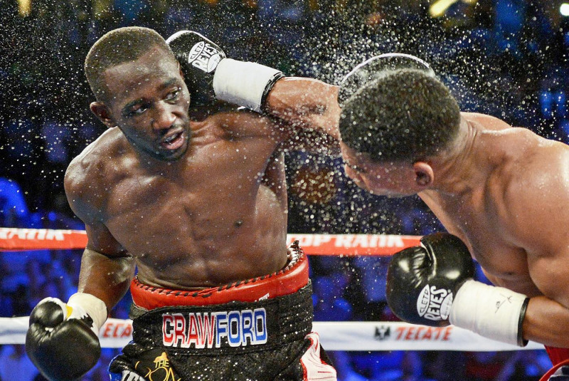 王者クロフォードのクロスカウンターが相手のテンプルにクリーンヒットする (c)Naoki Fukuda