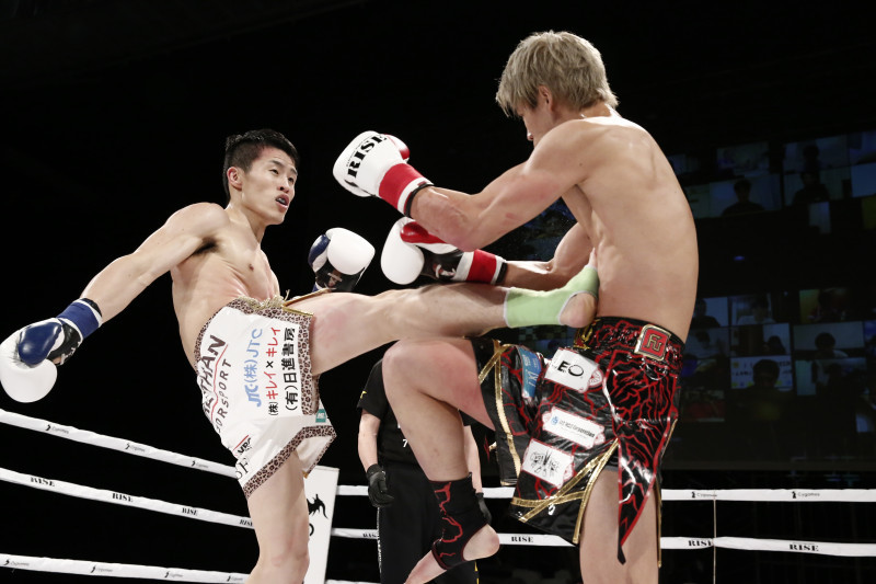 白鳥のボディにキックを蹴り込む小川(c)RISE
