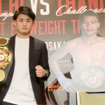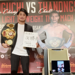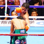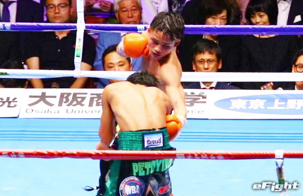 元ルンピニー王者・ナコーンに得意の左レバーブローを叩き込む京口=19年6月