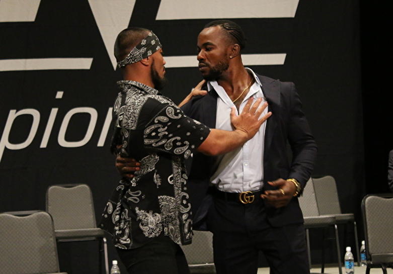組み付かんとするカルンダ(右)と手塚(左)が一触即発