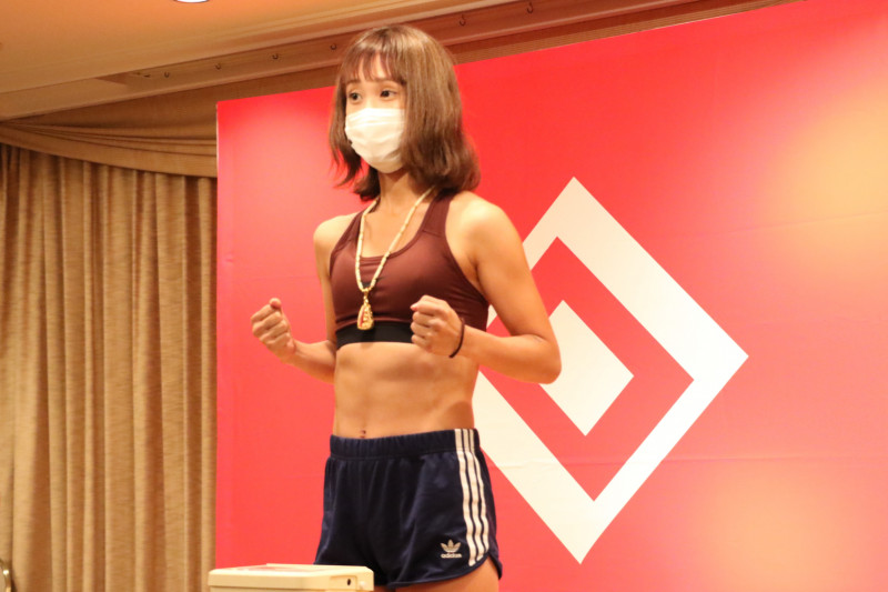 ムエタイスタイルを武器にするKARENが計量パスしガッツポーズ
