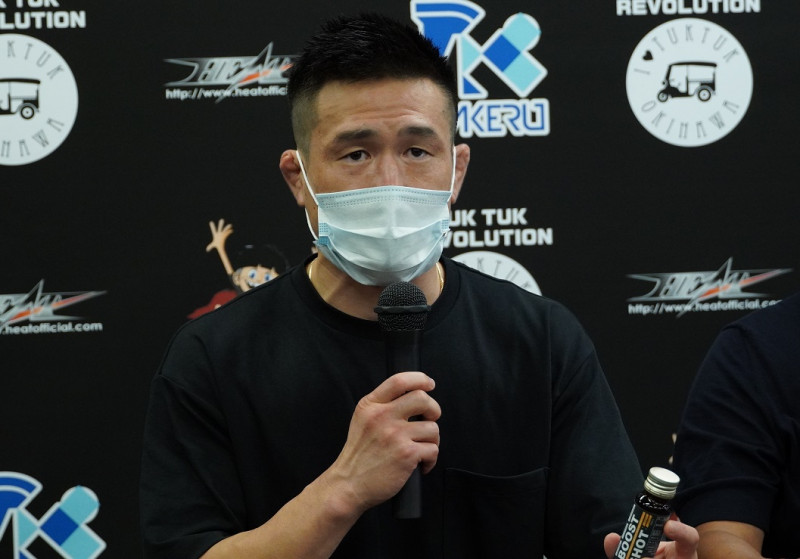『BOOST SHOT』を手にしながら飲用の感想を述べる春日井 寒天 たけし